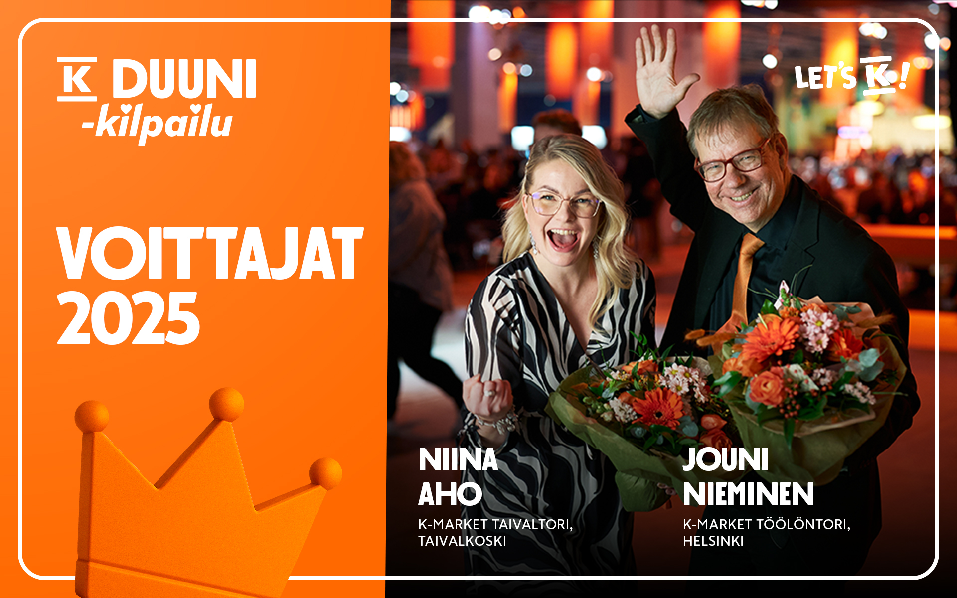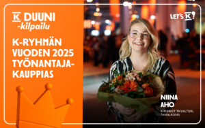 K-gruppens Årets arbetsgivarköpman 2025 är Niina Aho från K-Market Taivaltori i Taivalkoski och Årets butikspersonal 2025 är Jouni Nieminen från K-Market Töölöntori i Helsingfors. Vinnarna i K-Duuni-tävlingen offentliggjordes vid K-gruppens yrkesevenemang K-Team-dagarna den 1.11.2025.