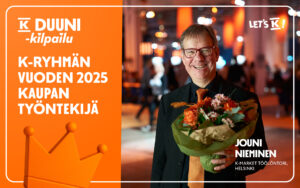 K-Market Töölöntorin kassamyyjä Jouni Nieminen on K-Duuni-kilpailun K-ryhmän Vuoden 2025 kaupan työntekijä. Jouni tunnetaan kaupan omana ilon lähettiläänä; hän tervehtii asiakkaita hymyssä suin, useilla kielillä ja on aina aidosti läsnä.